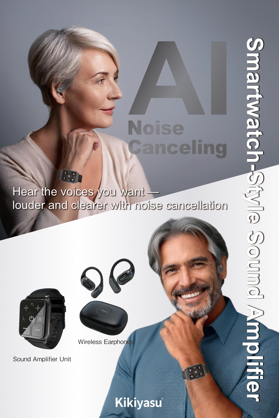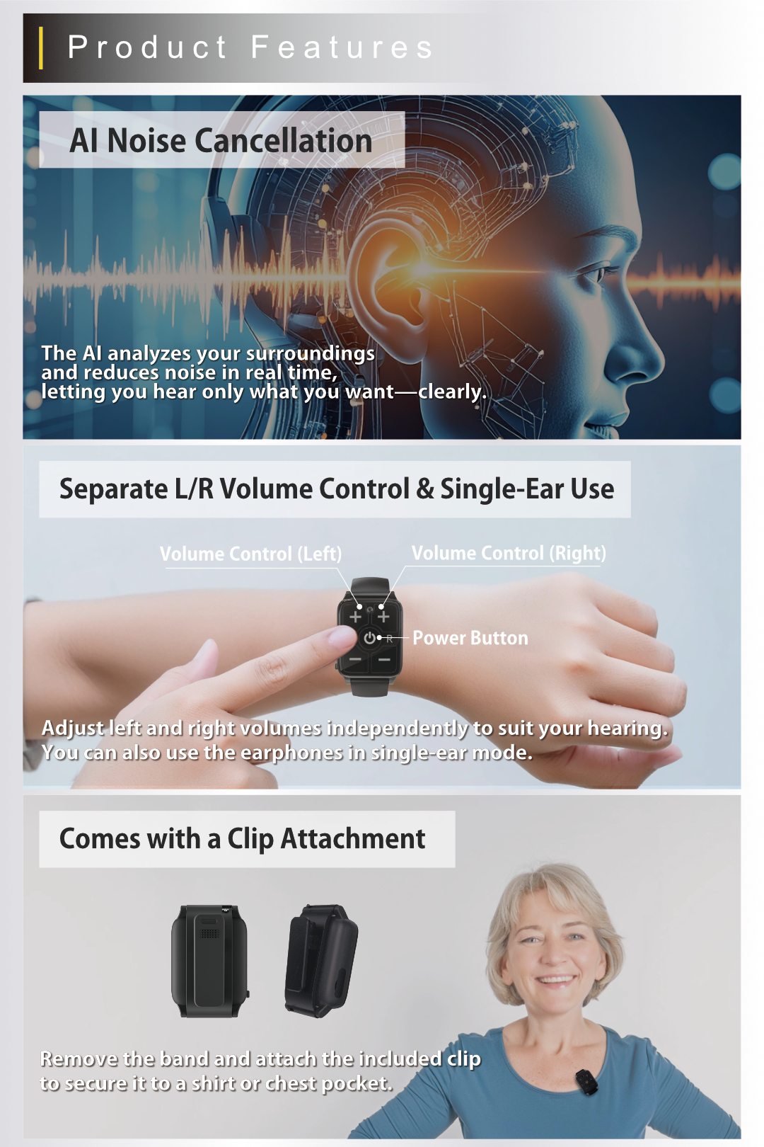 The main unit worn on the wrist captures sound clearly, while the wireless earphones allow you to hear it loudly and with clarity. With a separate design that splits the sound-collecting unit from the earphones, the device suppresses howling (feedback) and delivers a stress-free, comfortable listening experience.