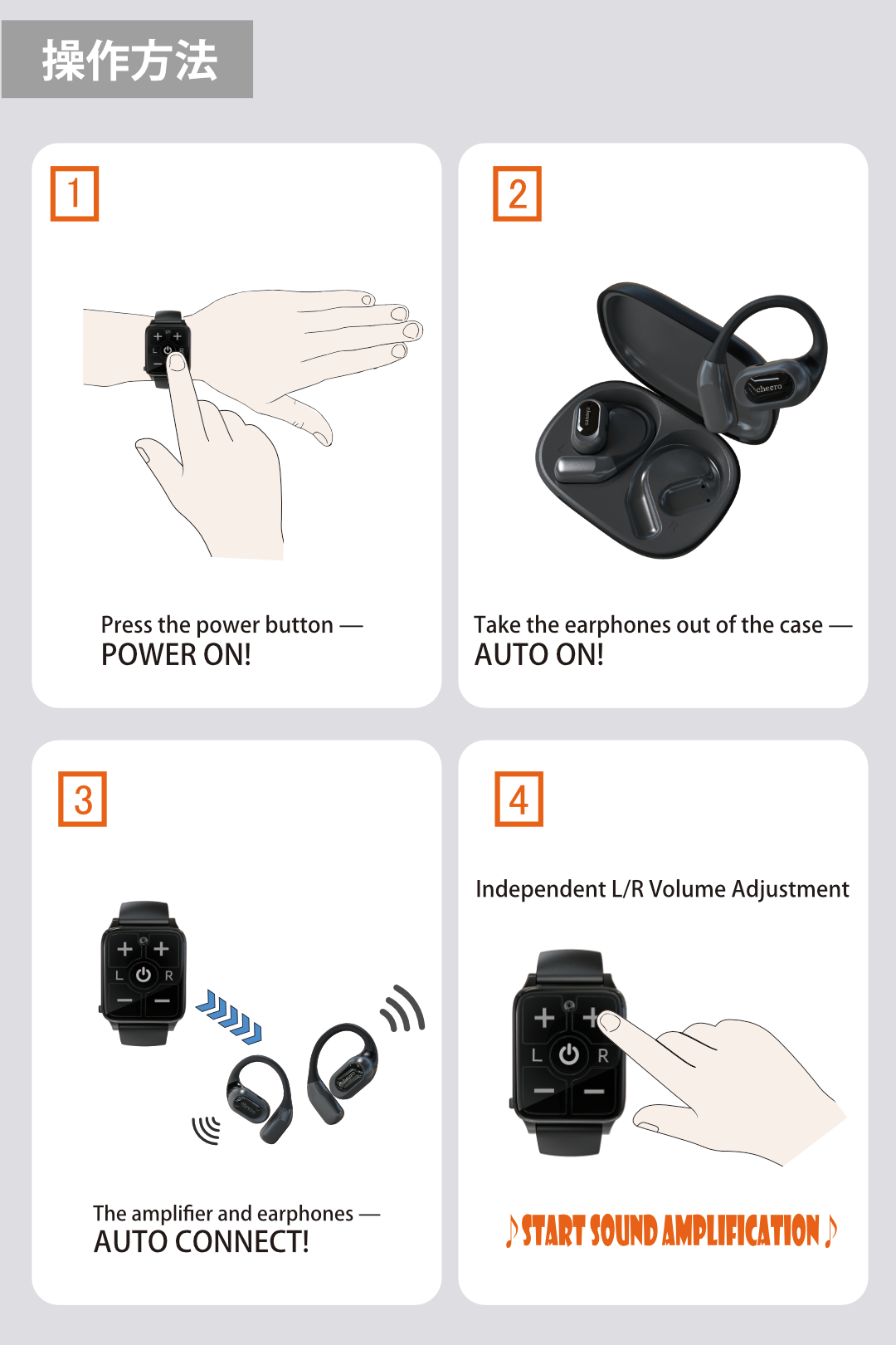 The sound amplifier and wireless earphones come pre-paired, so you can start using them immediately. Just take them out of the box and turn on the power. With only a power button and volume buttons, the design is simple and intuitive—even for those who aren’t comfortable with gadgets.